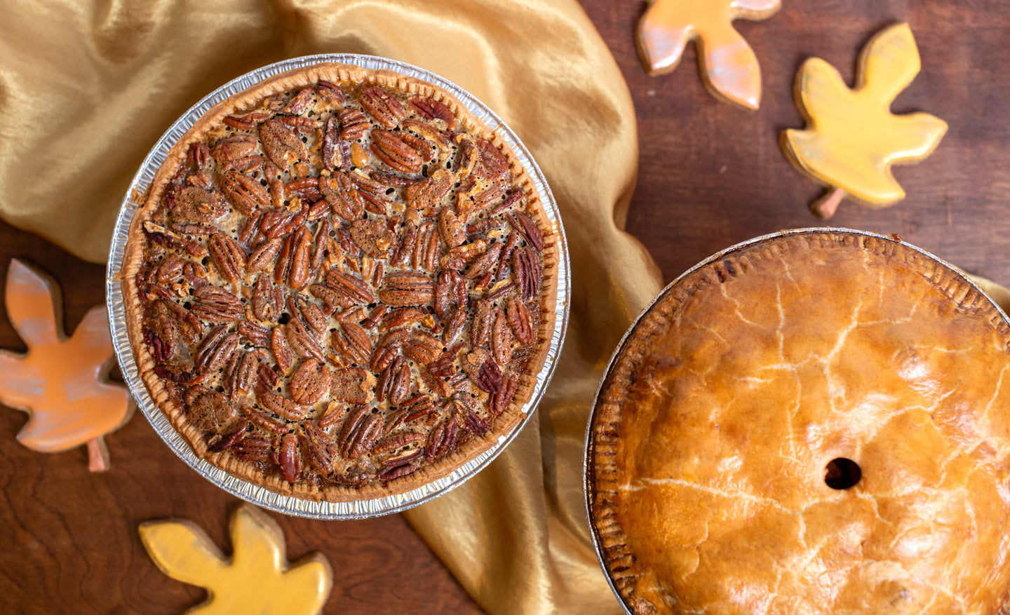 Traditional flaky butter pie crust in a 10" deep dish tin. Apple, Pumpkin, Pecan, Chocolate Mousse, Peanut Butter and more!