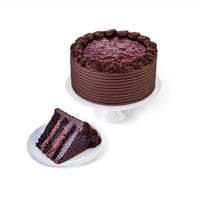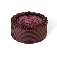 Chocolate buttermilk cake filled with chocolate mousse and seedless raspberry jam. Frosted with chocolate ganache and topped with seedless raspberry jam.